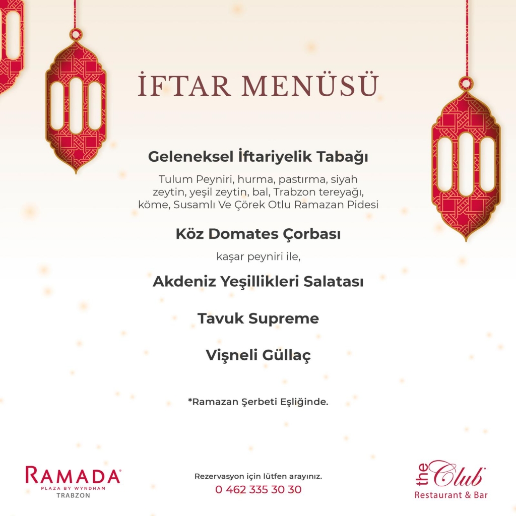 - Tulum Peynir, Hurma, Pastırma, Siyah Zeytin, Yeşil Zeytin, Bal, Trabzon Tereyağı, Köme, Susamlı ve Çörek Otlu Ramazan Pidesi